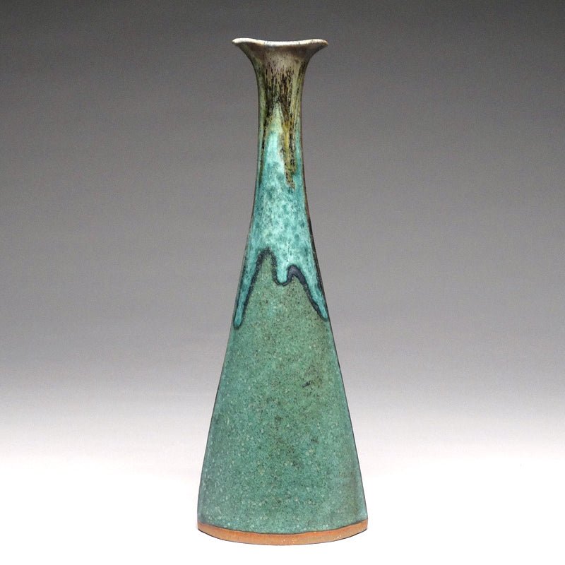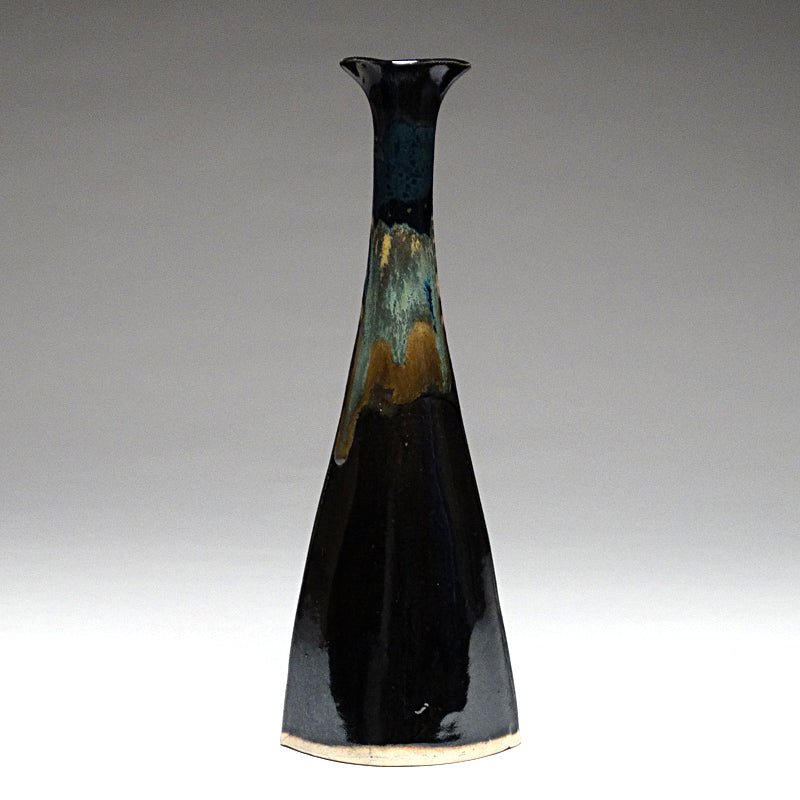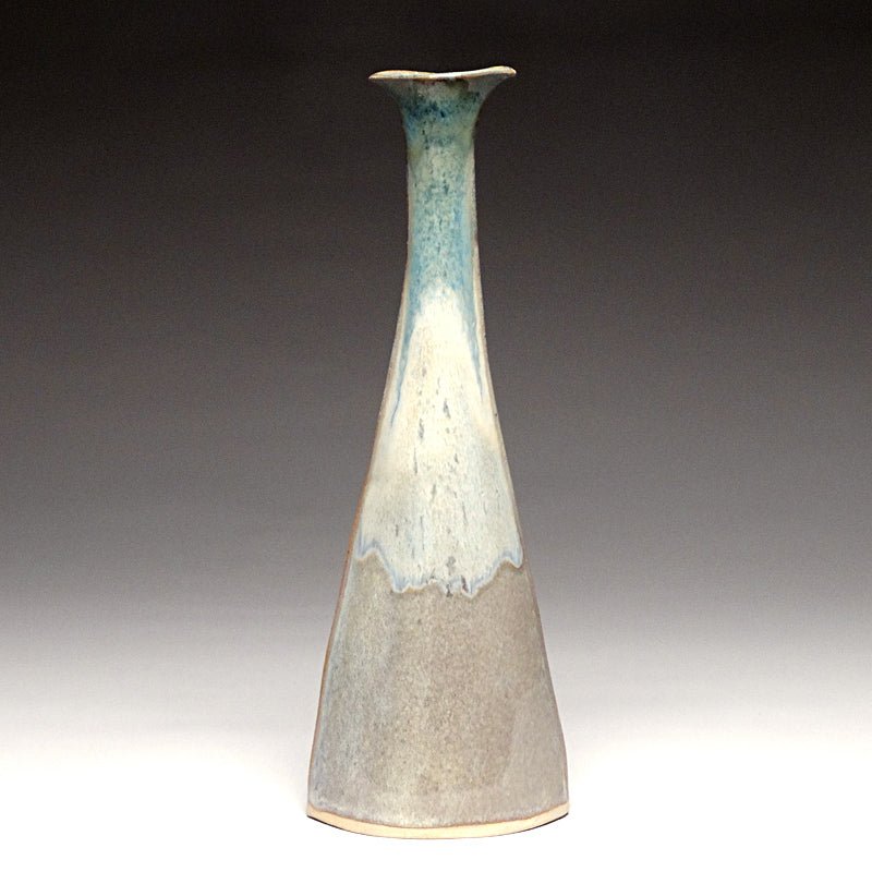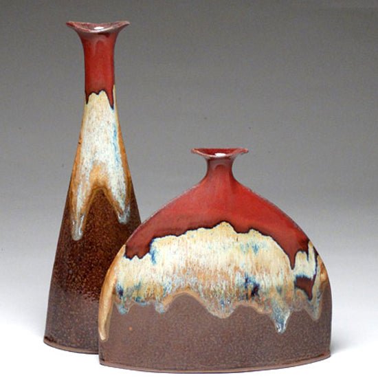 Two sided slab-built stoneware vases with the widest point at the bottom, making them very stable. The flat nature of these vases make them suitable for niches, ledges and window sills.