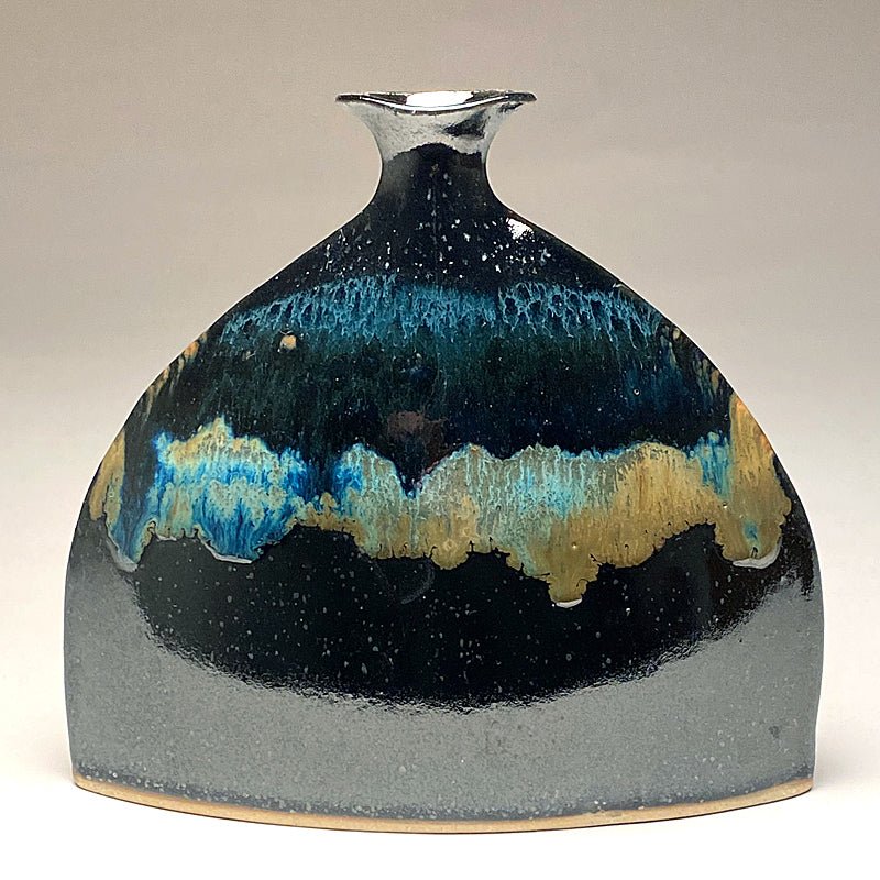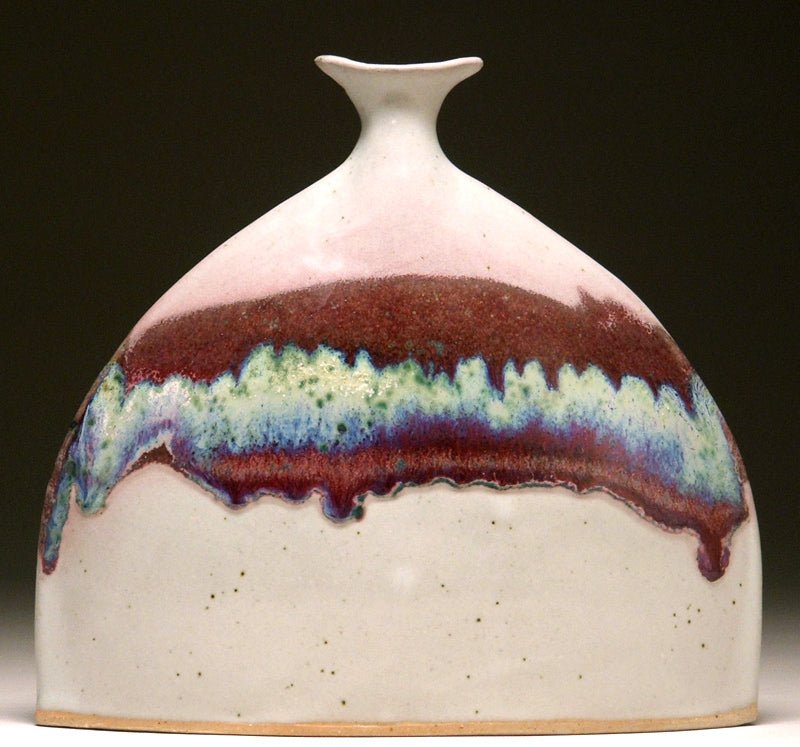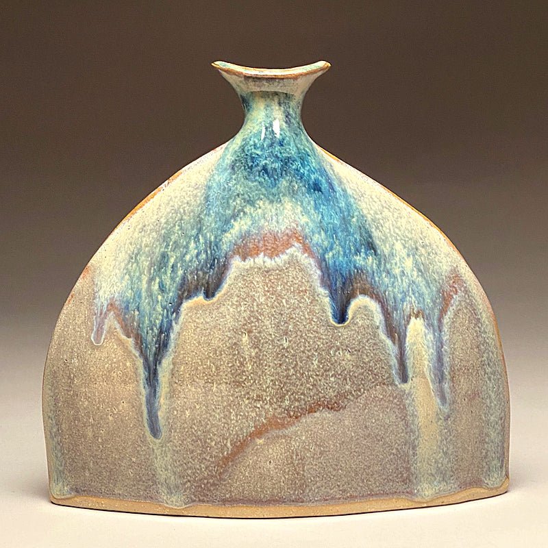 Two sided slab-built stoneware vases with the widest point at the bottom, making them very stable. The flat nature of these vases make them suitable for niches, ledges and window sills.